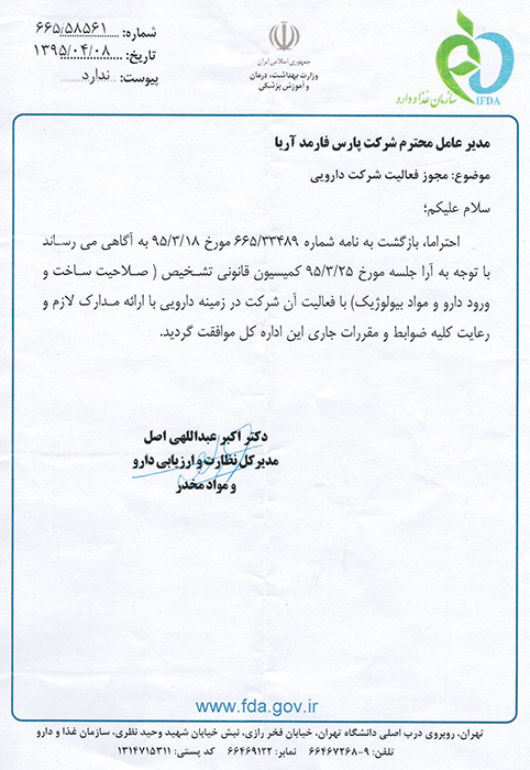 Pharmaceutical export license from the Food and Drug Administration of Iran
