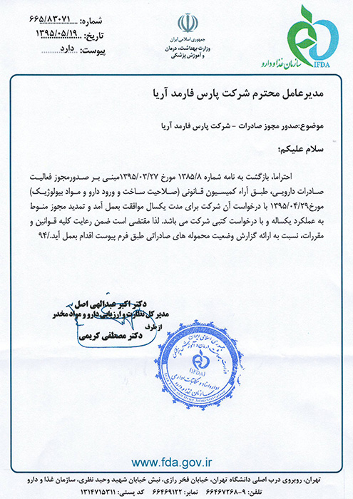 Pharmaceutical export license from the Food and Drug Administration of Iran